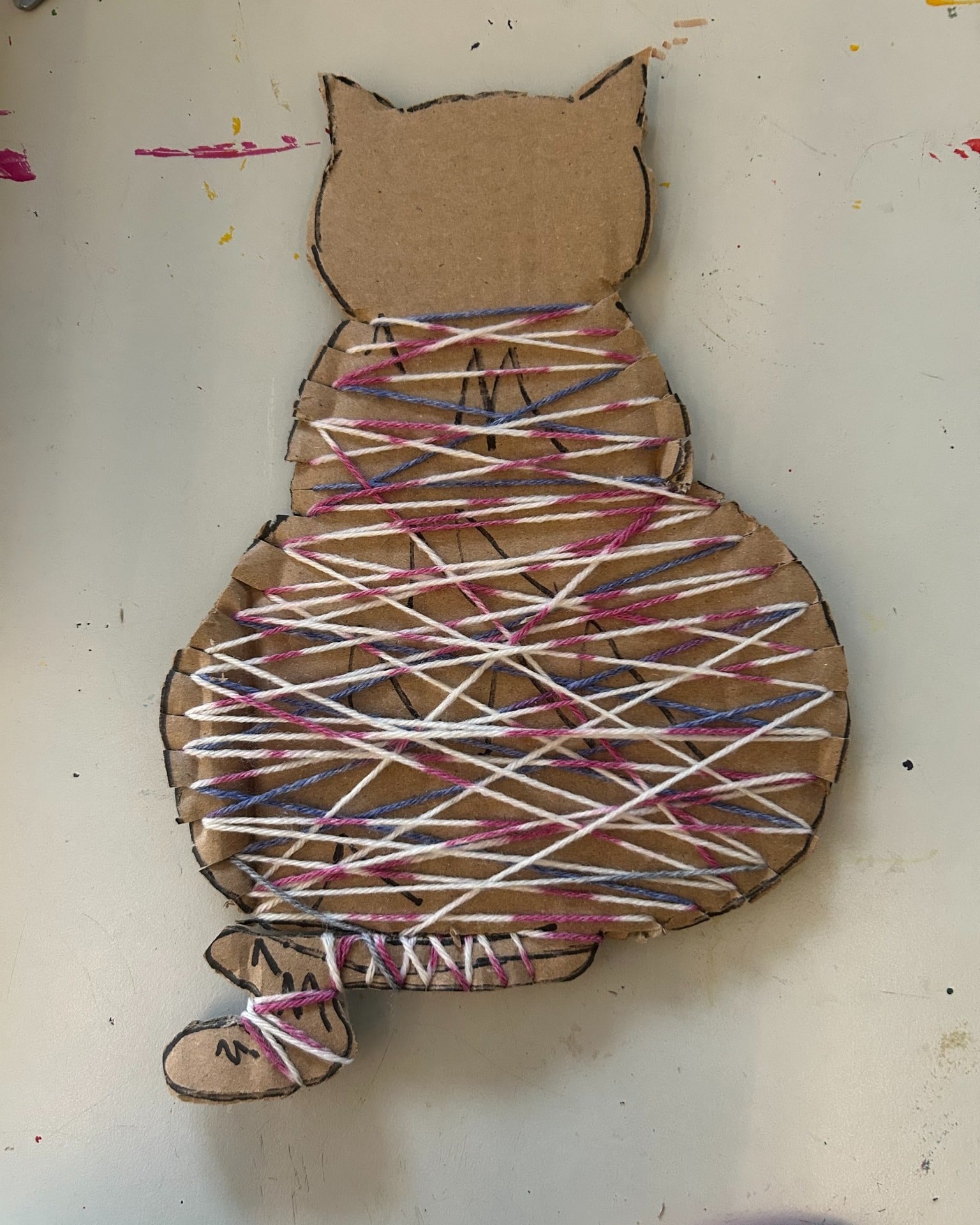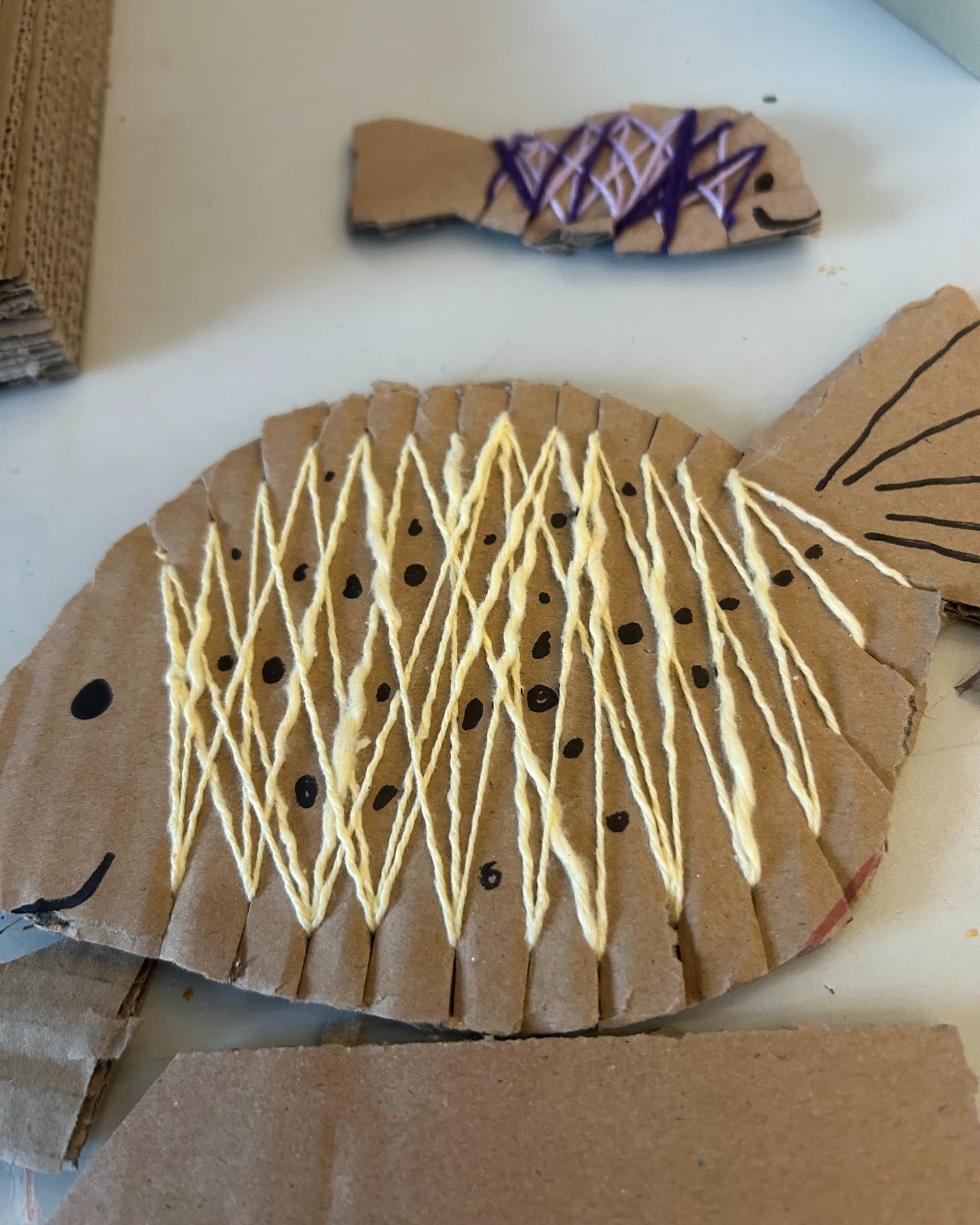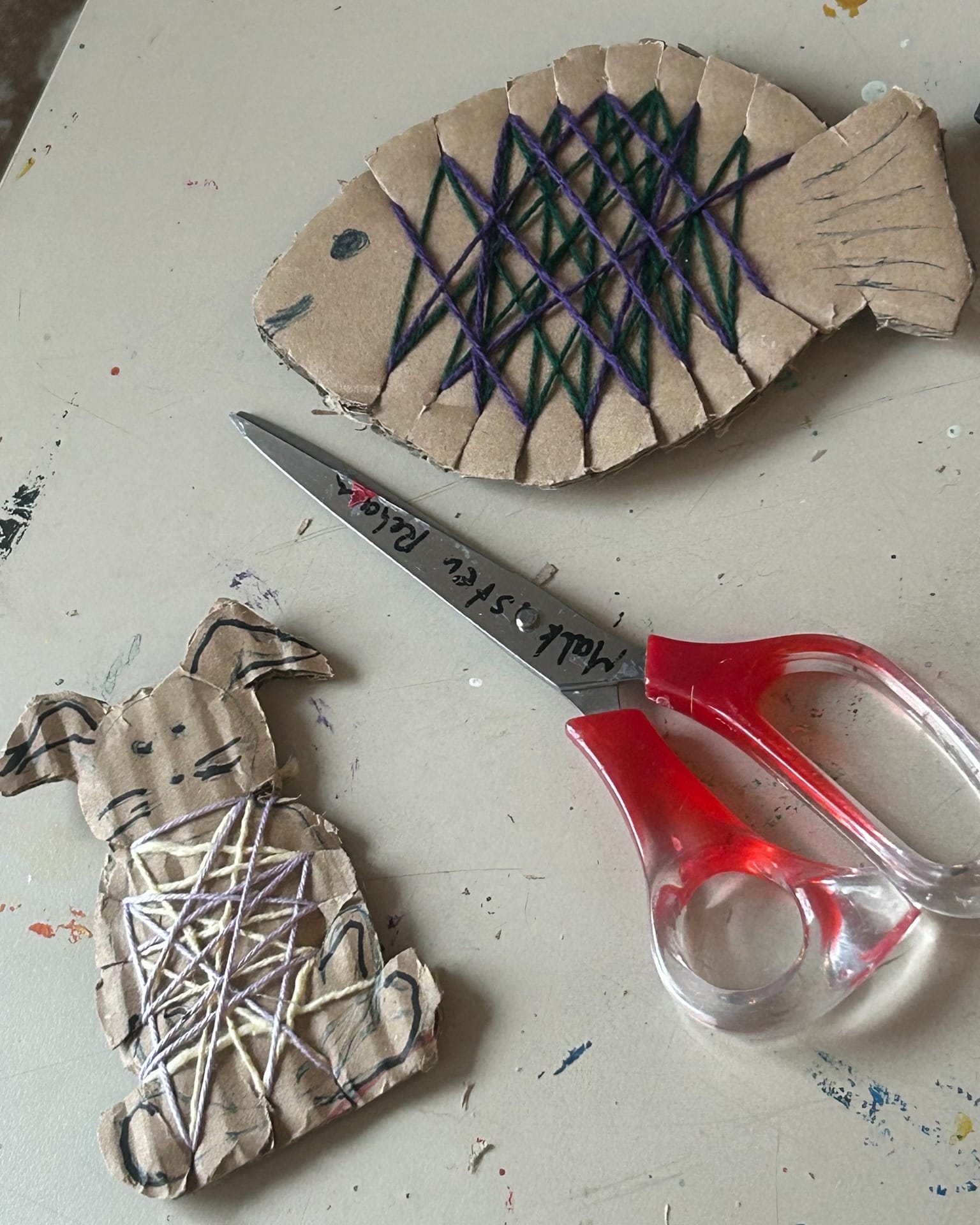 Mit Pappe als Grundlage und ganz viel bunter Wolle entstanden fantasievolle Fische und Katzen. Die Wolle wurde gewickelt, gespannt, gekreuzt und kombiniert – jede Arbeit entwickelte dabei ihren ganz eigenen Charakter.