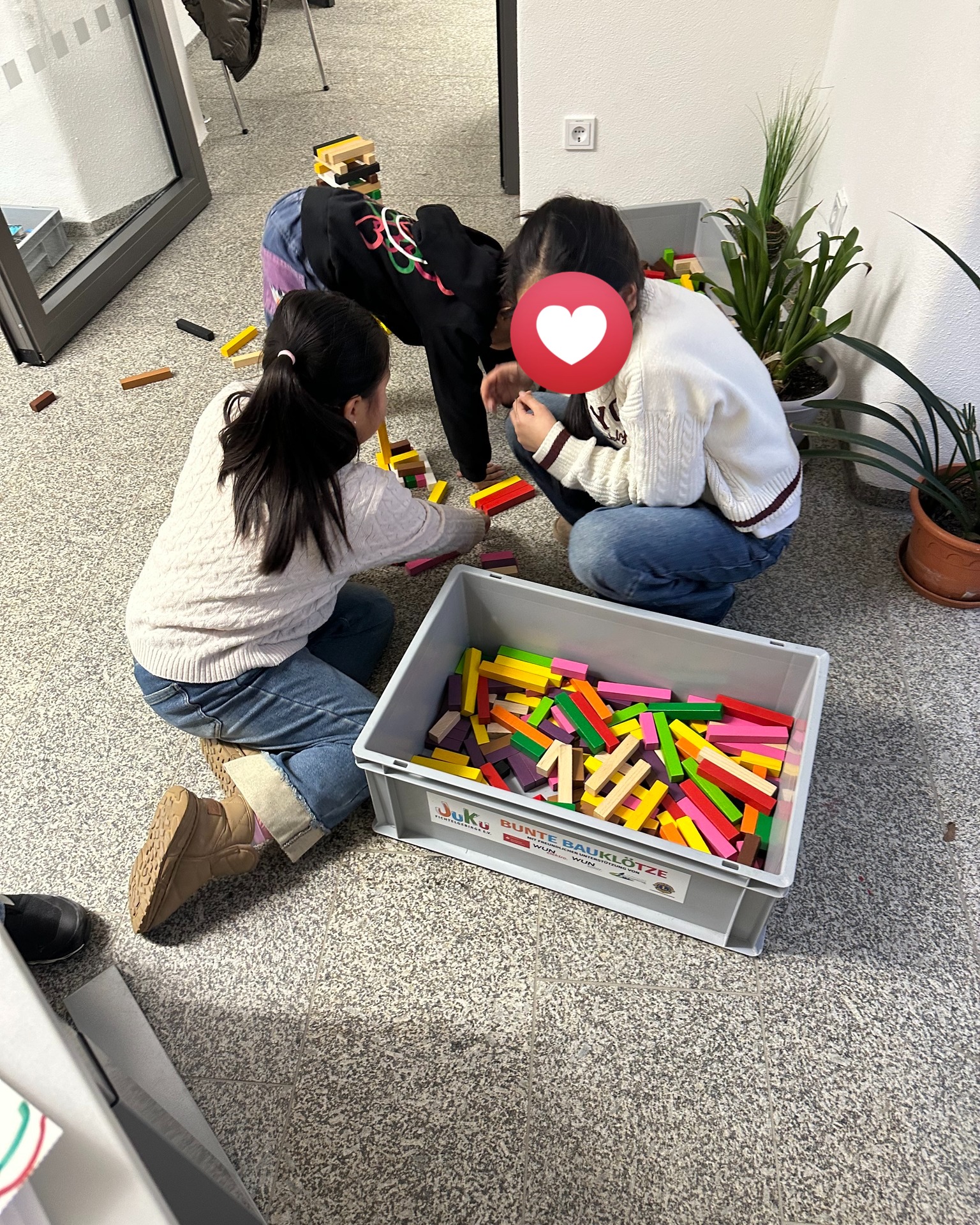 Der Tisch reichte kaum aus, also wurden kurzerhand die Bausteine am Boden zur Erweiterung des kreativen kulturellen Bildungsangebots genutzt. Improvisation gehört eben dazu.