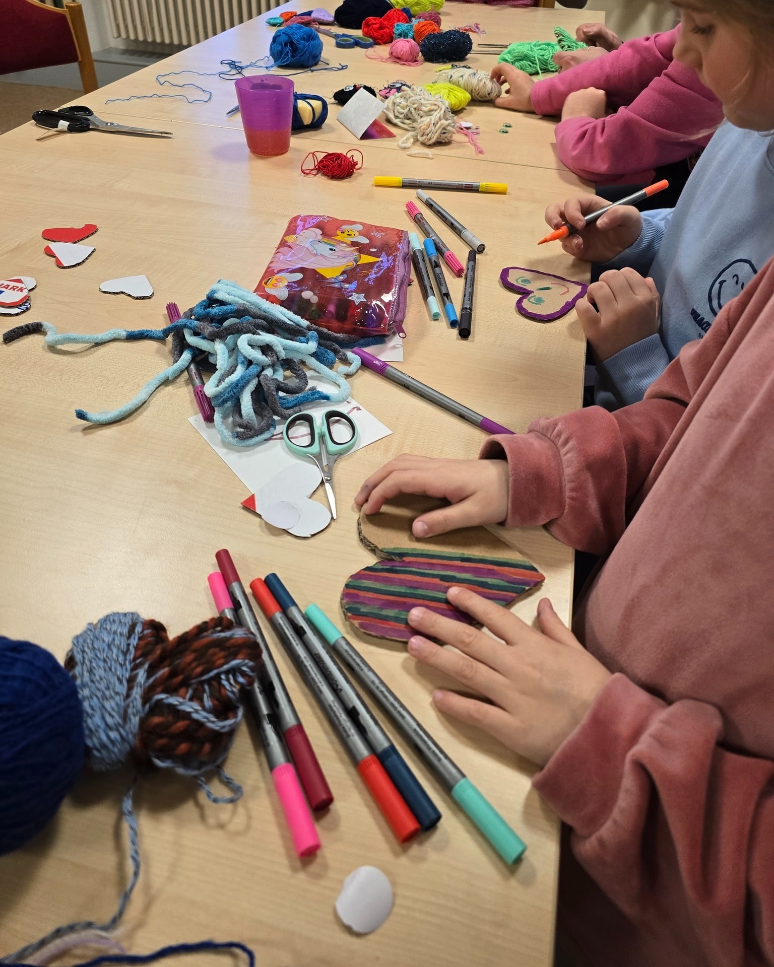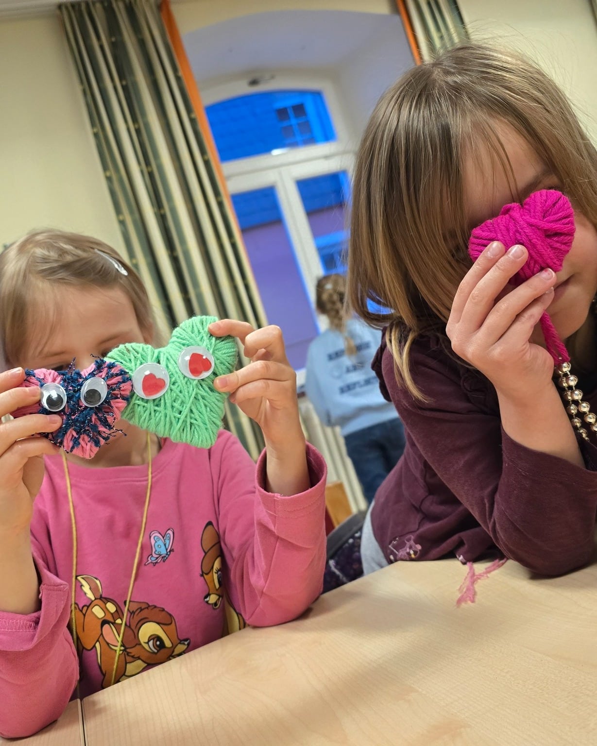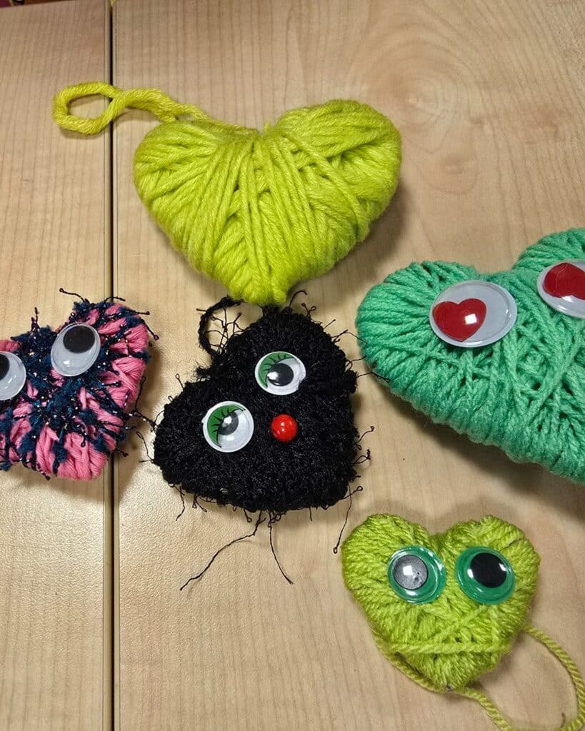 Im Gemeindehaus Lichtenberg wurden vorbereitete Pappherzen mit bunten Wollfäden umwickelt und liebevoll gestaltet. Wackelaugen, Perlen und viele kleine Details machten jedes Herz zu einem ganz eigenen Kunstwerk.
