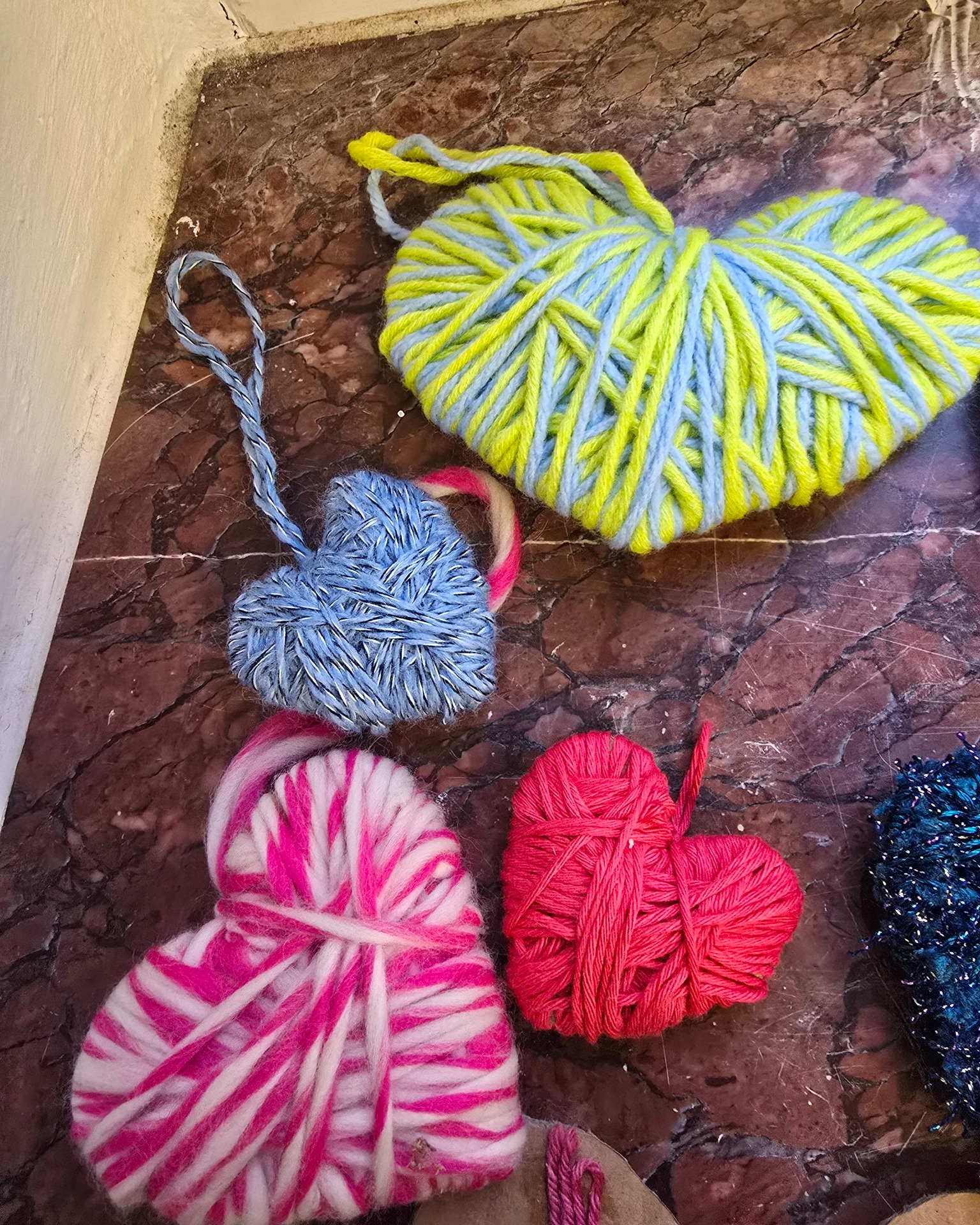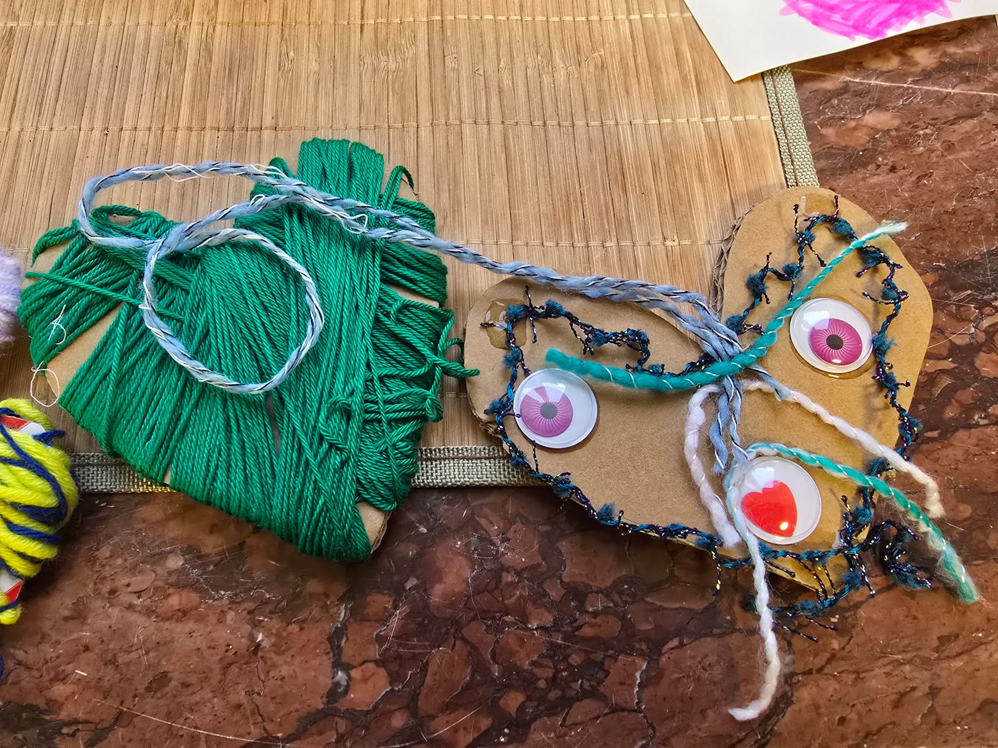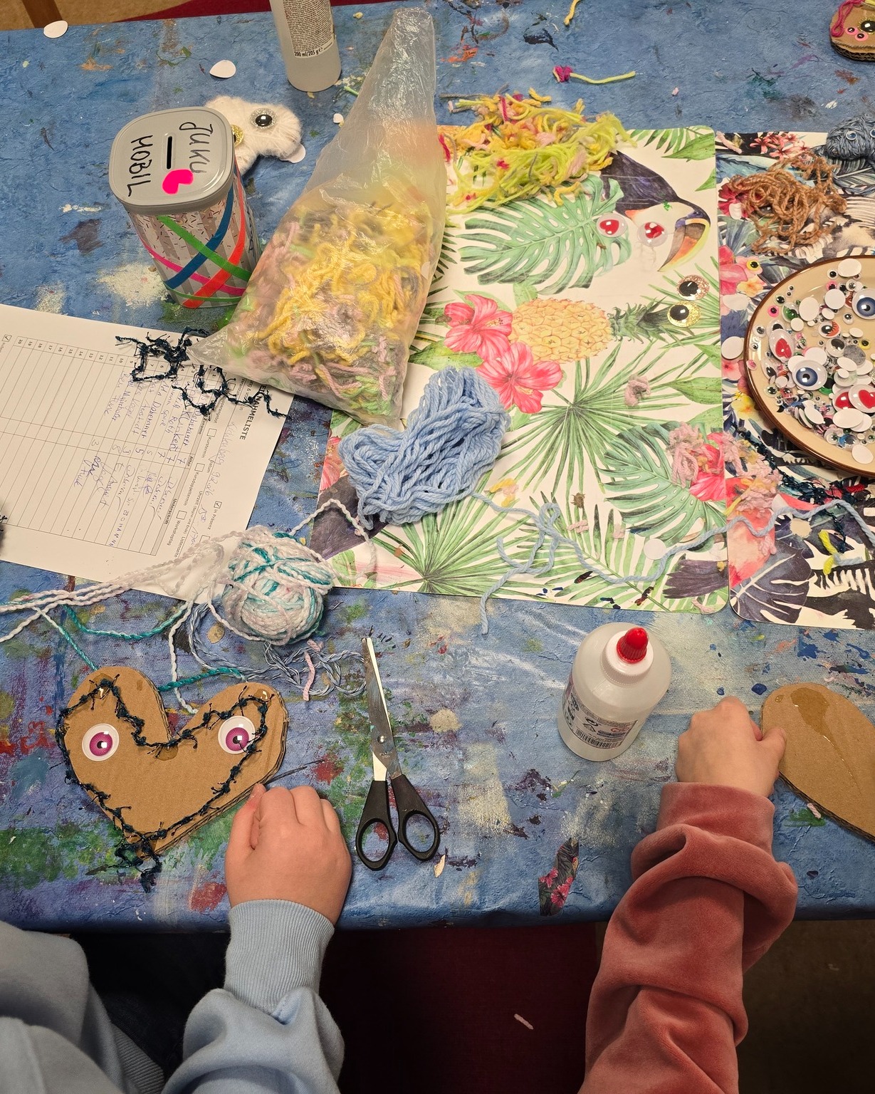 Im Gemeindehaus Lichtenberg wurden vorbereitete Pappherzen mit bunten Wollfäden umwickelt und liebevoll gestaltet. Wackelaugen, Perlen und viele kleine Details machten jedes Herz zu einem ganz eigenen Kunstwerk.
