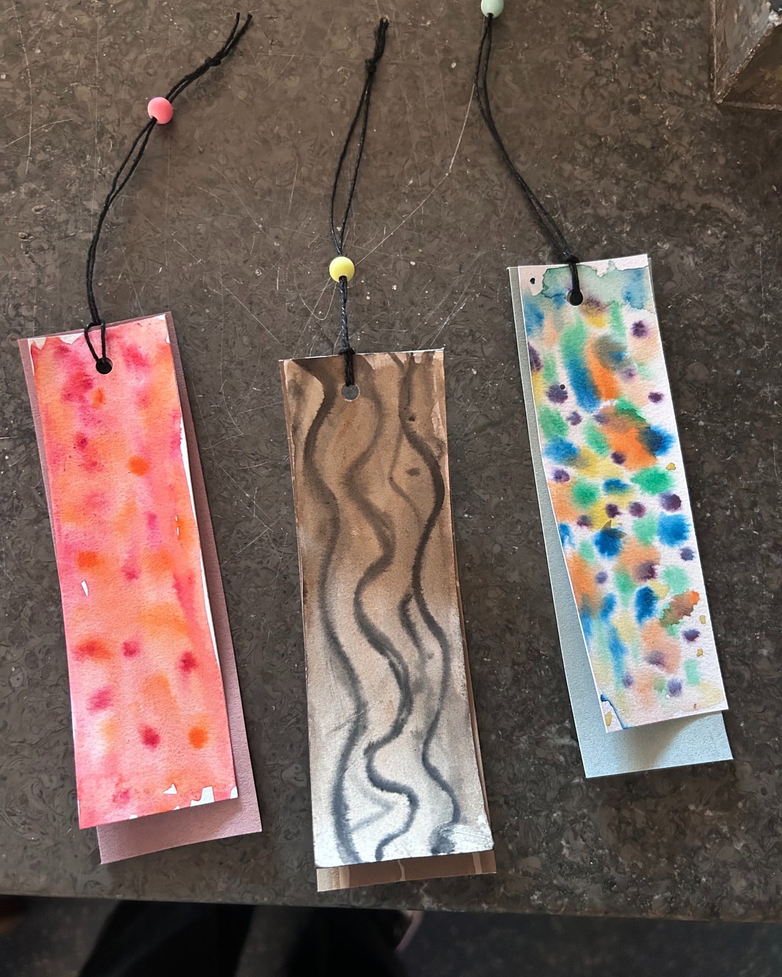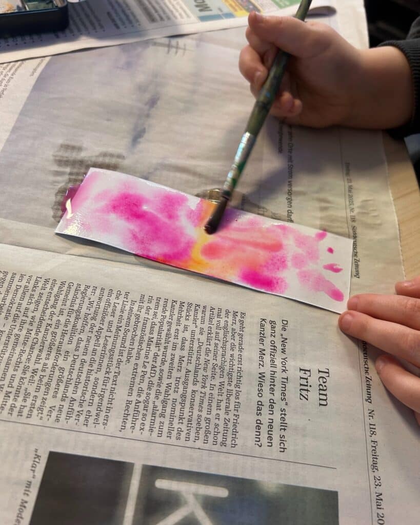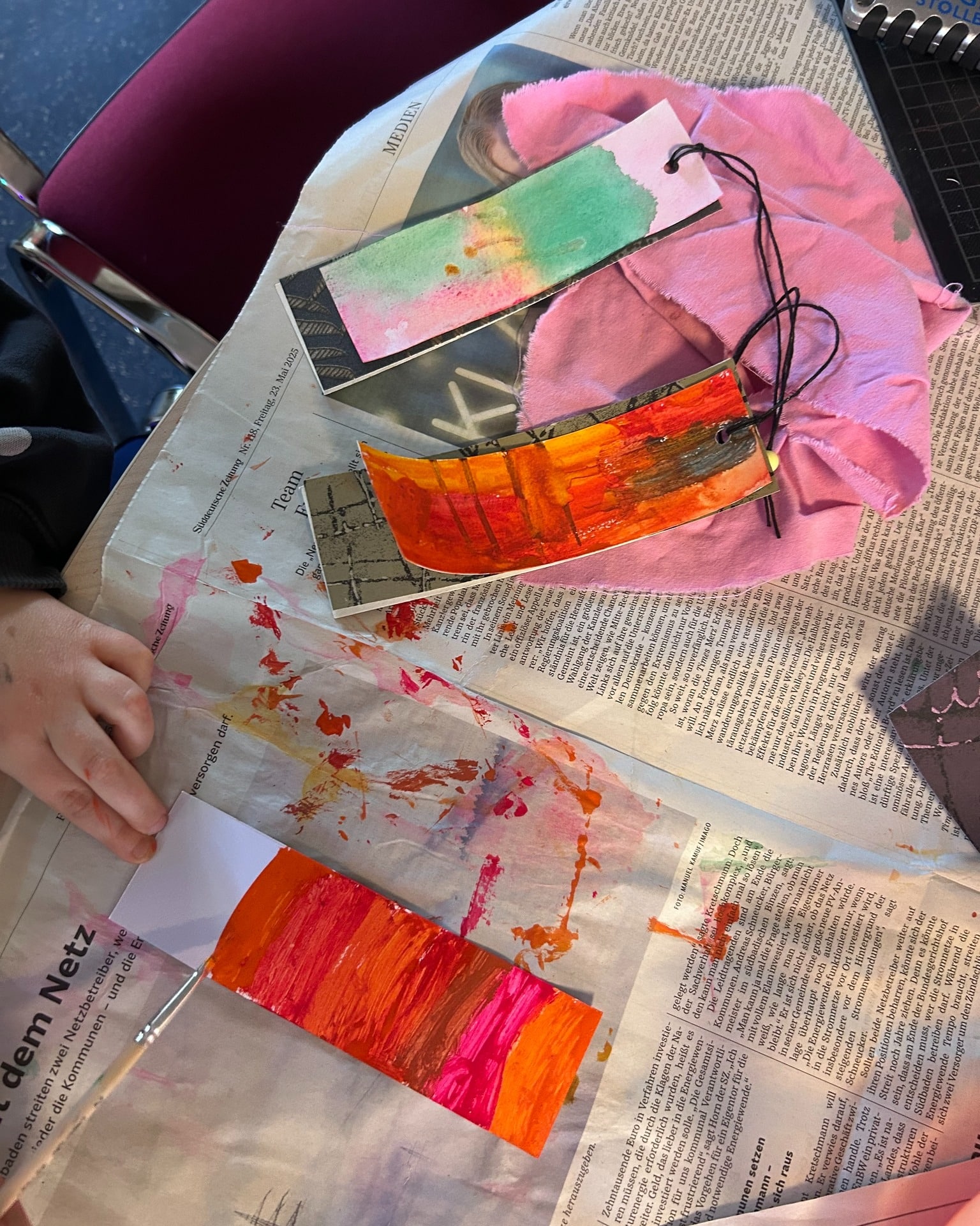 Auch im Jugendtreff Oberkotzau wurde es kreativ – und richtig farbenfroh! Gemeinsam haben wir Lesezeichen in Aquarelltechnik gestaltet, mit Schnur versehen, Perlen aufgefädelt und mit Tapetenresten gedoppelt.