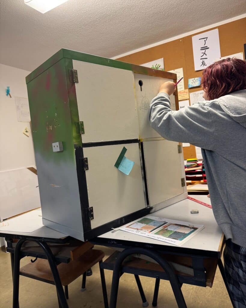In Kooperation mit wundersam anders durften die Teilnehmer:innen der jungeKUNSTschule nun ihr erstes großes Projekt bearbeiten: den bereits entwickelten mobilen Escape Raum. Dieser wird nun thematisch bemalt und gestaltet, passend zu der Geschichte des kaputten Skateboards, welches die Teams kooperativ wieder zusammenbauen müssen.