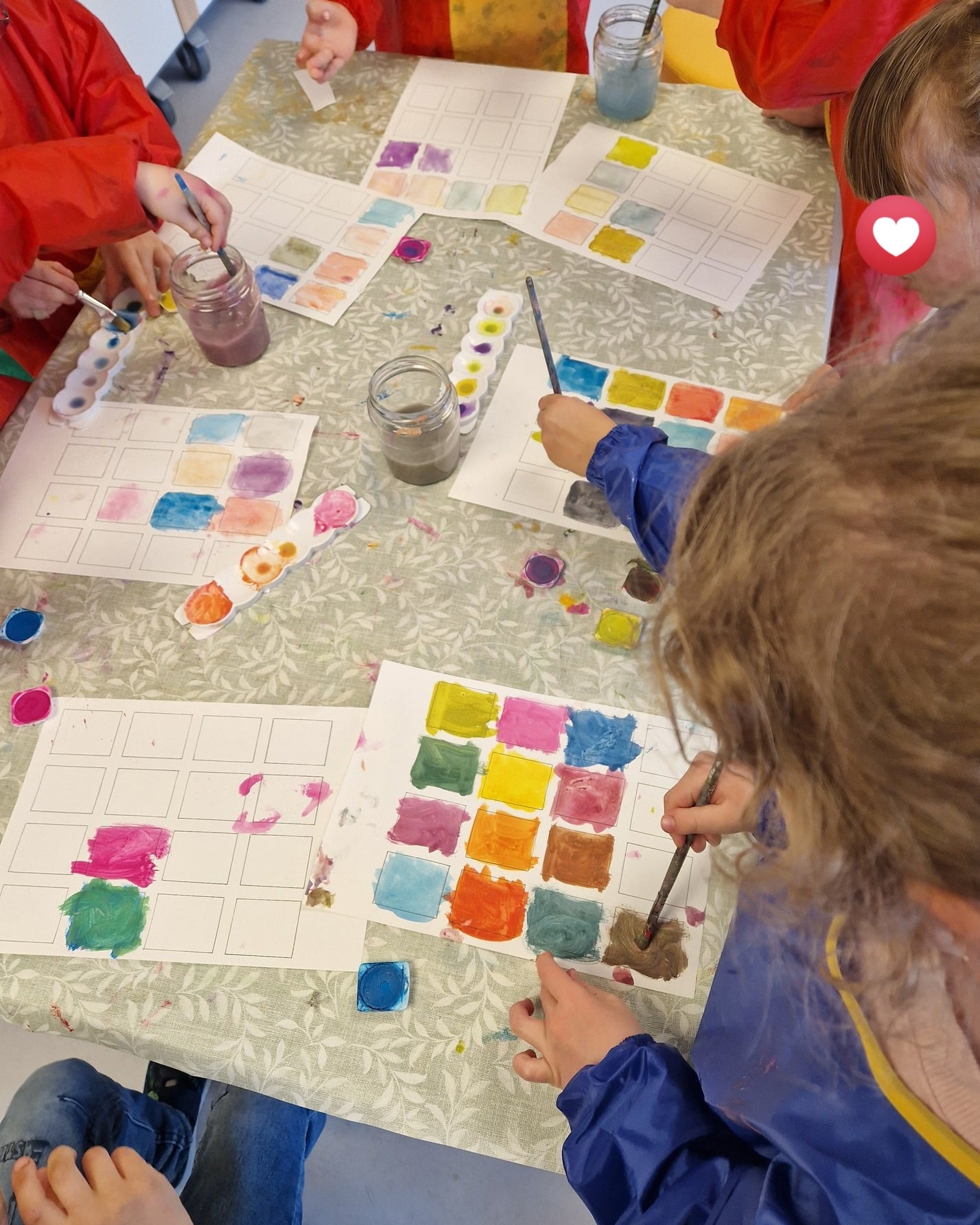 Bei diesem Termin haben die Kinder herausgefunden, dass aus Rot und Gelb Orange entsteht, aus Blau und Gelb Grün und aus Blau und Rot Violett. Die entstandenen Mischfarben wurden auf Papier festgehalten. Danach ging es ans bunte Malen, bei dem jede:r die neuen Farbmischungen ausprobieren konnte.