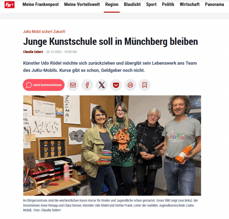 Künstler Udo Rödel möchte sich zurückziehen und übergibt sein Lebenswerk ans Team des JuKu-Mobils. Kurse gibt es schon, Geldgeber noch nicht. Link zum Artikel: „Kostenpflichtiger Artikel“